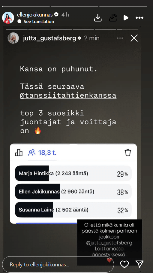 “7705 äänestäjää ja kansan ykkösvaihtoehto @tanssiitahtienkanssa juontajaksi on @ellenjoikikunnas.”