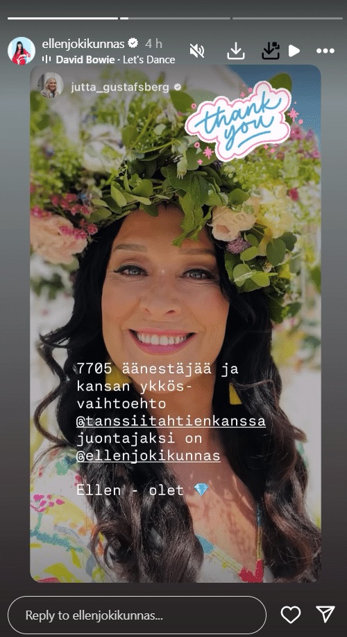 Ellen reagoi kyselyn tuloksiin heti Instagram-tarinoissaan. Hän jakoi Jutan julkaisun tekstillä: