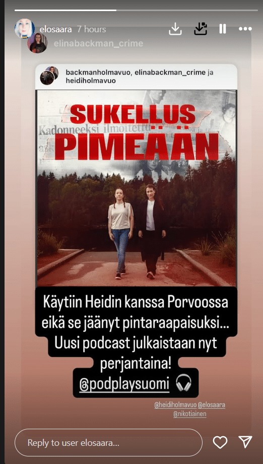 Hän on tuottanut useita suosittuja audiosarjoja ja liittyi vuonna 2025 toimittajien Heidi Holmavuon ja Elina Backmanin seuraan rikospodcastissa Sukellus pimeään. Mainostaessaan julkaisua hän kirjoitti Instagram Storiesissa: